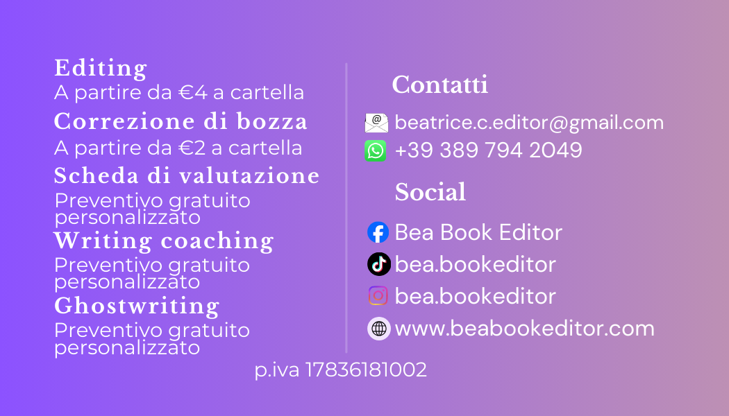 Lavoro come editor e correttrice di bozze, collaborando soprattutto con scrittori emergenti. Accompagno i testi nel loro percorso di crescita, curandone la forma, la struttura e la precisione linguistica, nel rispetto della voce e dell’intenzione dell’autore.