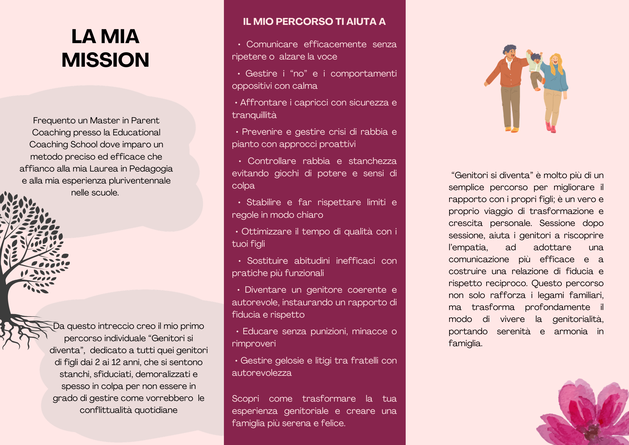 Lavoro con genitori che si sentono stanchi, confusi o inadeguati e che desiderano migliorare il rapporto con i propri figli (dai 2 ai 12 anni), senza urla, minacce e punizioni, senza ripetere le cose mille volte, senza sensi di colpa o soluzioni improvvisate e incoerenti. Aiuto mamme e papà a gestire rabbia, pianti, capricci, regole e comunicazione quotidiana, trasformando le difficoltà di ogni giorno in occasioni di crescita e relazione.