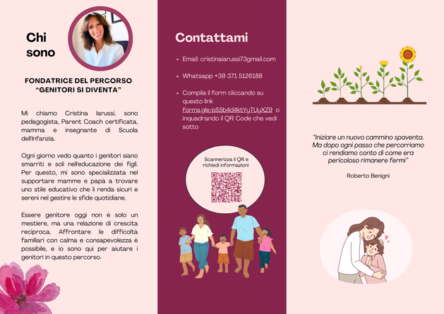 Credo in una genitorialità consapevole, possibile e umana. Non prometto figli “perfetti”, ma genitori più sicuri, presenti e coerenti, capaci di guidare i propri figli con fermezza, sicurezza e ascolto. Offro consulenze educative, percorsi individuali e risorse in pdf pensati per chi vuole davvero cambiare il clima familiare, partendo da sé, e per chi cerca ascolto, soluzioni e una guida concreta nel viaggio più importante, quello di essere genitori.
