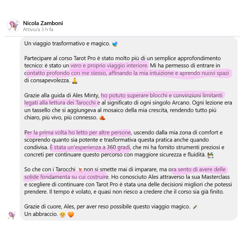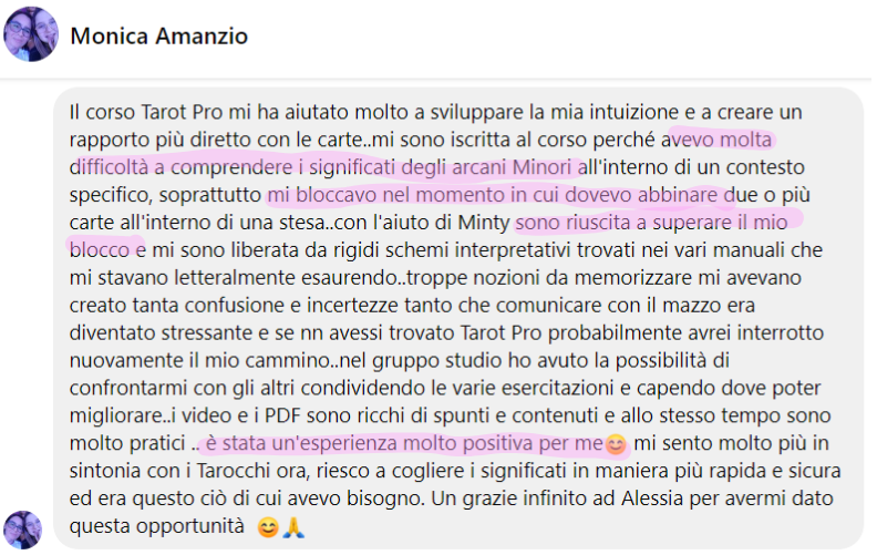 Attraverso la Minty Tarot Academy, negli ultimi anni ho aiutato decine di studenti a trasformare il loro modo di leggere i Tarocchi: da interpretazioni rigide e incerte, a letture fluide, accurate e professionali. Credo che i Tarocchi non siano un insieme di formule da imparare, ma un ponte verso la tua intuizione.